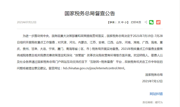 7月12日,國家稅務總局發布督查公告,涉及18個省份。