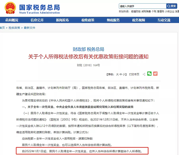 文件中明確:自2022年1月1日起,個人取得年終獎不再適用優惠算法,即不能再單獨計稅,應并入當年綜合所得計算繳納個人所得稅。