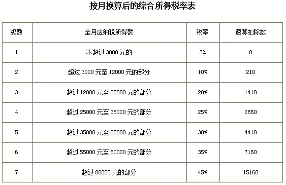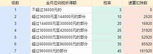 適用稅率:以全年一次性獎金收入除以12個月得到的數額對照月度稅率表確定: